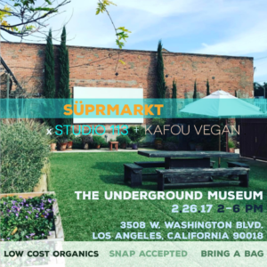 SÜPRMARKT will be setting up to vend 100% organic fruits, veggies, coconut oil, and almonds between 2-6 PM.